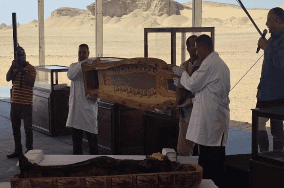 Archaeologists in Egypt opened an ancient mummy coffin in front of a live audience as they unsealed the first of 59 sealed sarcophagi found in Saqqara, revealing a mummy inside.