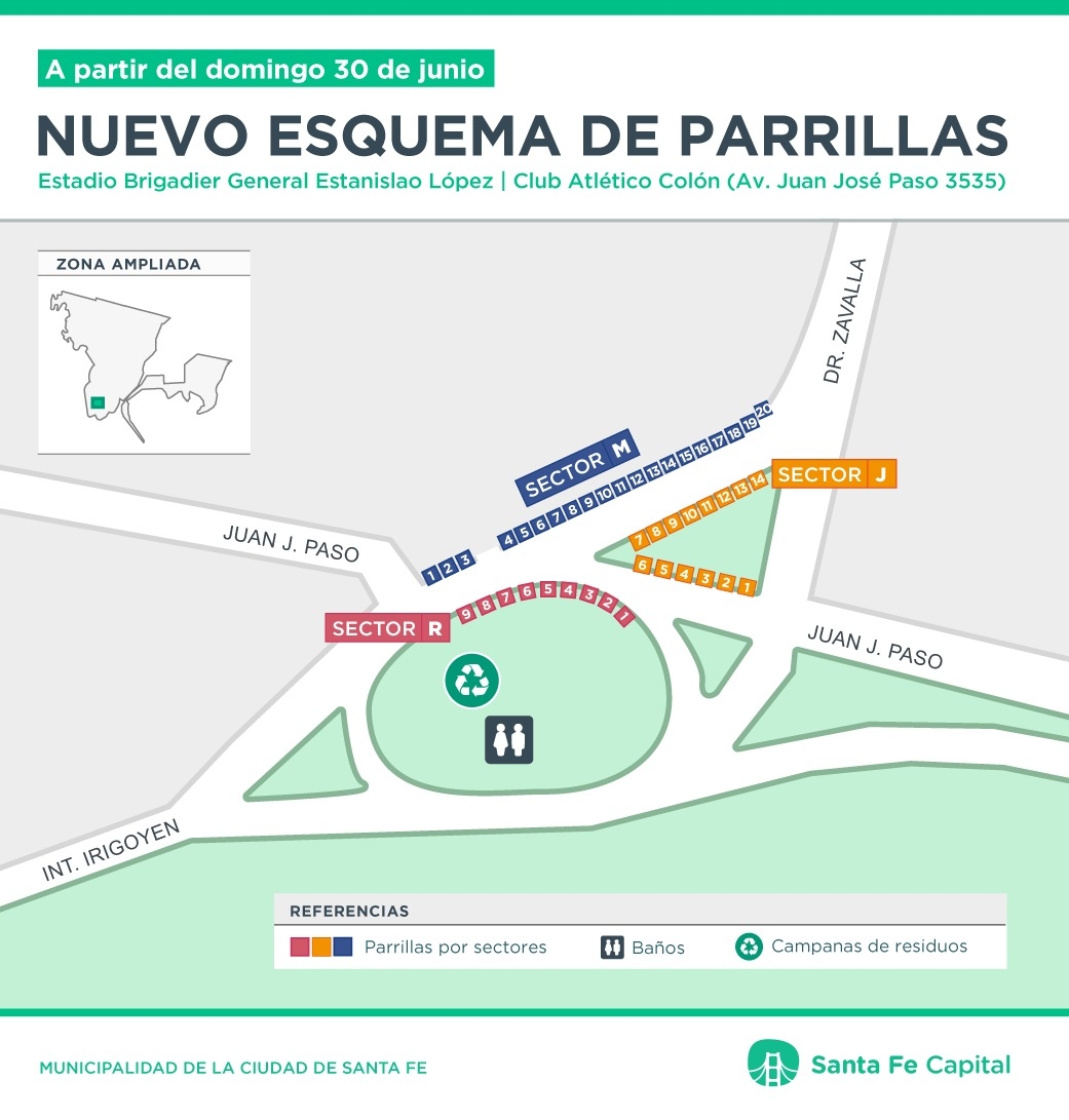La Municipalidad de Santa Fe, a través de un trabajo en conjunto con el Gobierno de la Provincia, implementará un sistema de reordenamiento de los puestos de comida (las parrillas), instalará baños químicos, colocará campanas de residuos y realizará un posterior trabajo de limpieza de la zona de la rotonda de la avenida Juan José Paso, frente al estadio de fútbol. El objetivo del ordenamiento es mejorar la convivencia ciudadana.