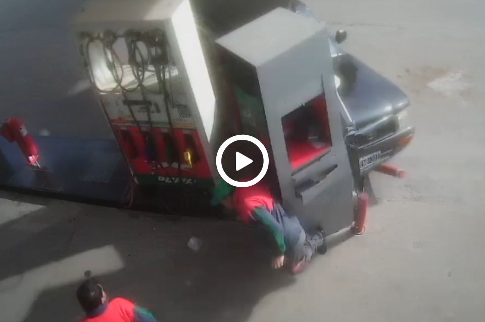 Un video de la cámara de seguridad de la estación de servicio muestra como los trabajadores estaban parados en el surtidor, y afortunadamente lograron correrse antes de que la camioneta lo impactara.