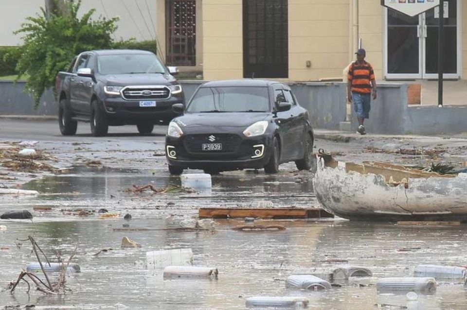 El lunes temprano, se vieron vehículos circulando por el paseo marítimo inundado en Bridgetown, Barbados.