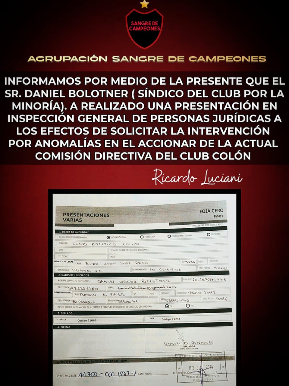 Algo que adelantó Diez en Deportes ya varios días atrás. Esto hizo, además de otras cosas más que todavía no tienen claridad, que la agrupación Sangre de Campeones le solicite a la IGPJ una intervención por "anomalías en el accionar de la comisión directiva".