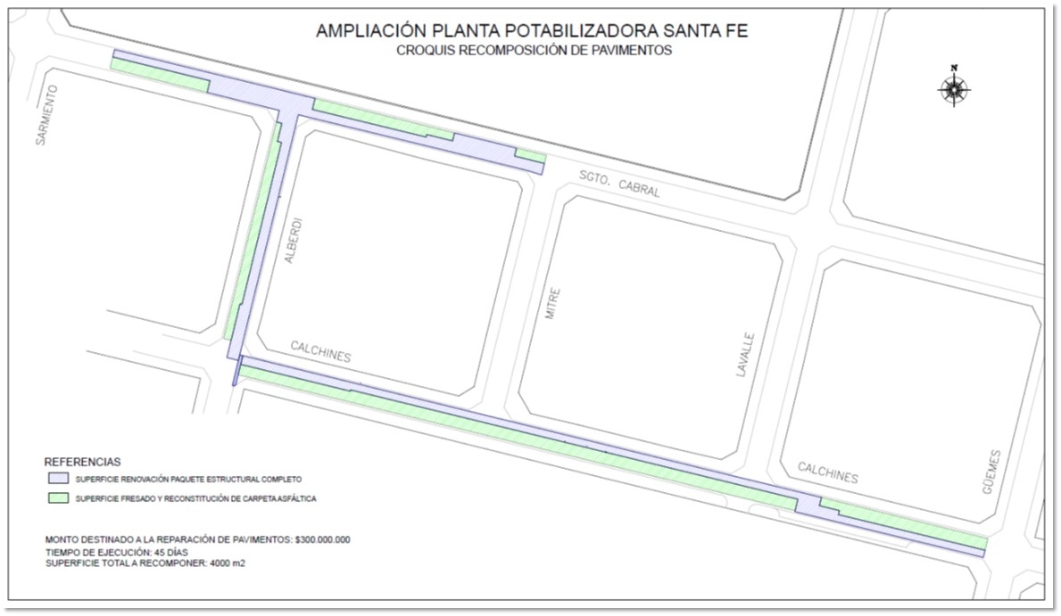 El total de la superficie que abarcarán los trabajos previstos corresponde a la reconstrucción completa del pavimento en la mitad intervenida de las calzadas donde se tendieron las nuevas cañerías y la otra parte a la renovación de la carpeta asfáltica de media calzada restante.