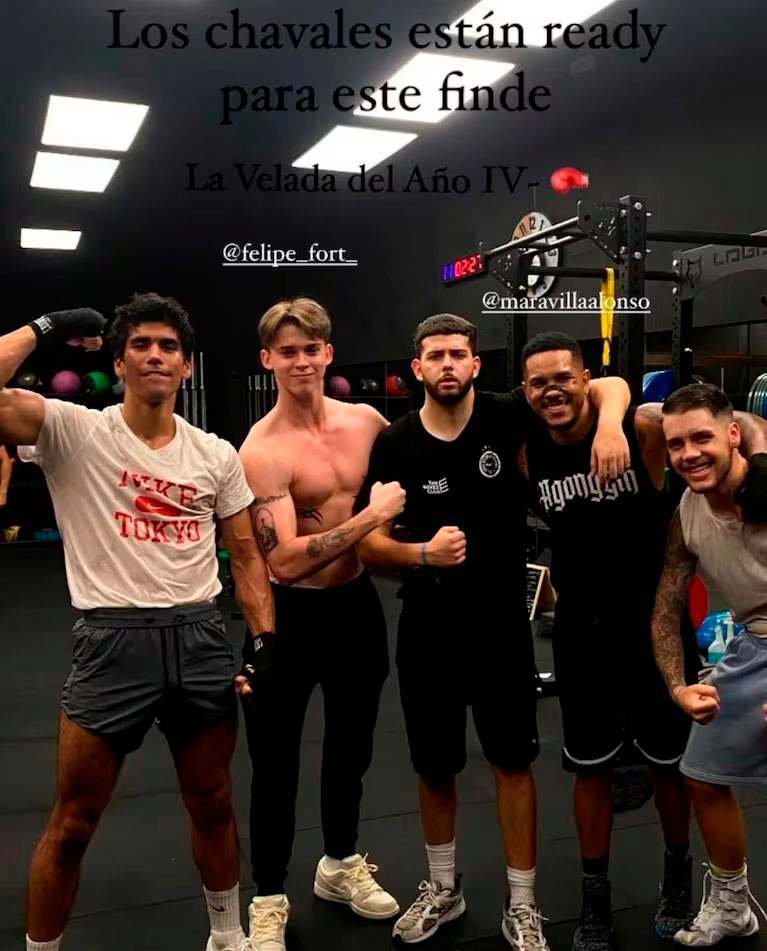 En la foto, publicada en sus Stories de Instagram, el joven influencer aparece con los músculos en primer plano y un mensaje que acompaña la imagen: “Los chavales están redy (listos) para este finde, la velada del año IV”.