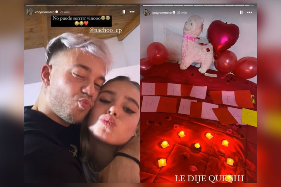 Pero eso no fue todo, el ex finalista de Gran Hermano preparó en la habitación de su pareja una propuesta romántica. En las fotos que compartió Coti se puede ver un acolchado rojo, pétalos de rosa, velas, un peluche y un cartel con una pregunta: “¿Querés ser mi novia?”