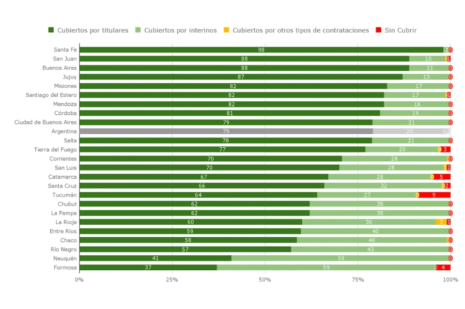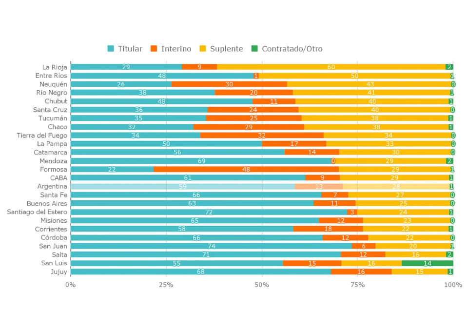La provincia con mayor porcentaje de suplencias en el sector estatal es La Rioja (62%); la proporción más alta en el sector privado se encuentra en Entre Ríos (44%).