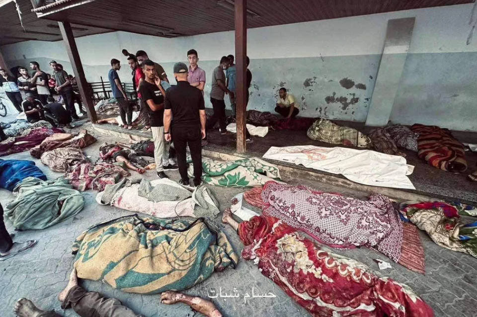 Los aviones de guerra israelíes atacaron la escuela Al-Tabi'in en el barrio Al-Daraj en el centro de la Ciudad de Gaza, mientras que las personas desplazadas en la escuela estaban realizando la oración Fajr.