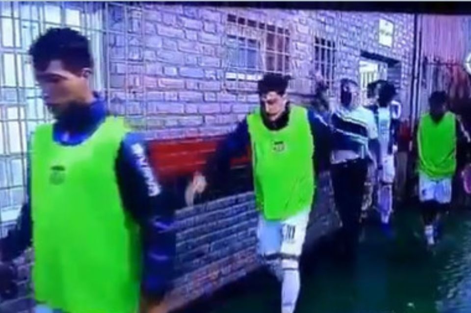 Se trató de una jornada de mucha lluvia en Santa Fe, y los accesos al campo de juego del Brigadier López estaban inundados. Y cuando estaban ingresando al campo de juego hizo ademán de ir nadando.