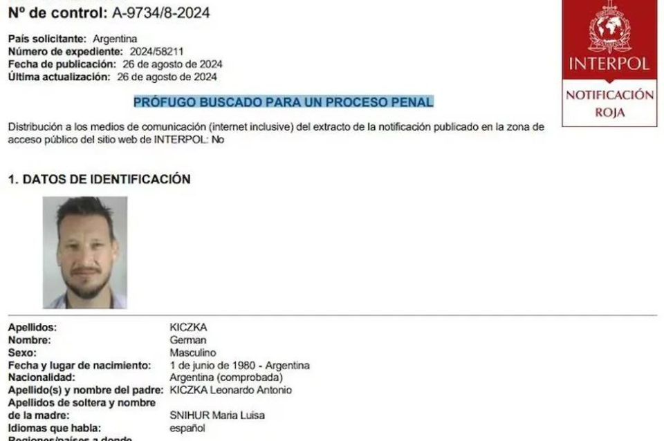 El alerta cuenta con todos los detalles del delito por el que se los acusa y la descripción de los hermanos Kiczka, de quienes se indicó que podrían haberse desplazado “por Brasil o Paraguay”.