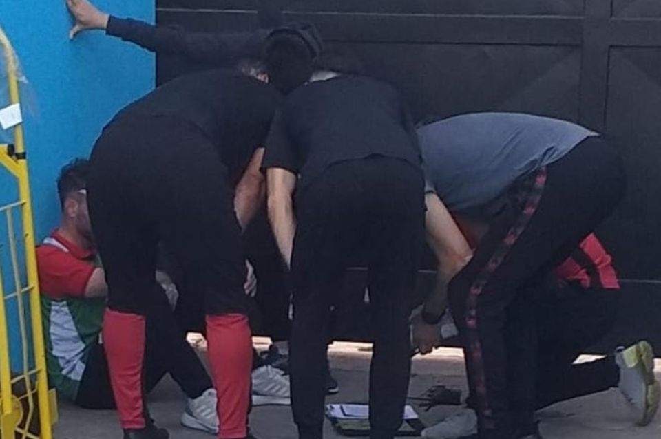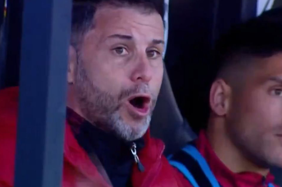Al DT se lo ve sentado en el medio, rodeado por sus colaboradores. Esto fue tomado de mala manera por los hinchas de Colón, a los cuales se les agotó la paciencia con el exentrenador de Barracas Central, Patronato e Independiente Rivadavia.