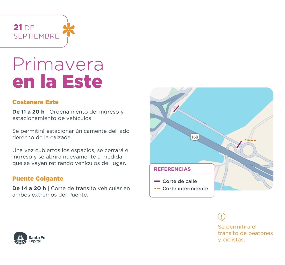 En la Costanera Este, de 11 a 20 horas, se permitirá estacionar en la margen derecha y la izquierda quedará liberada para una mejor circulación. También, de 14 a 20 horas, se interrumpirá la circulación en el Puente Colgante, solo se podrá pasar a pie o en bicicleta.
