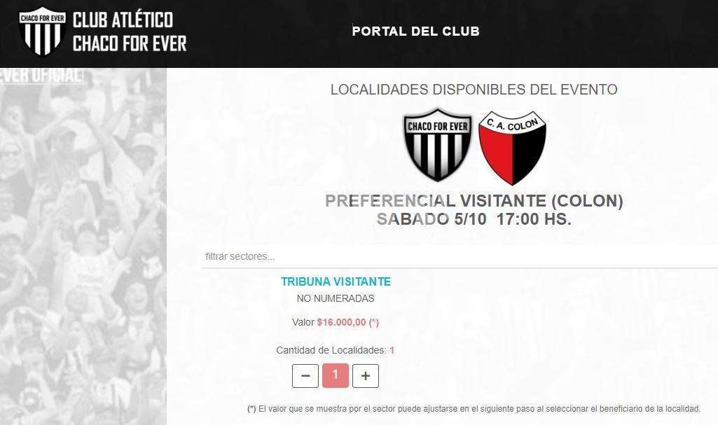 Este miércoles 25 de septiembre arrancó el expendio de entradas para el público visitante del partido que Chaco For Ever disputará ante Colon el próximo sábado 5 de octubre, por la Zona B de la Primera Nacional.