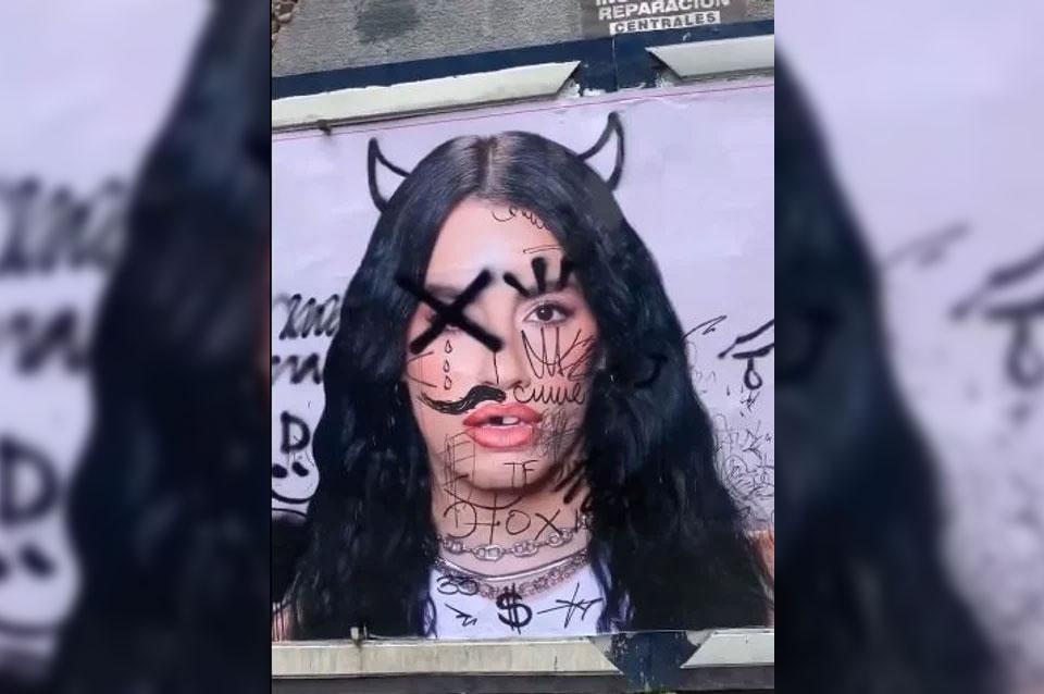 El cartel fue intervenido con cuernos sobre el rostro de la cantante, además de bigotes y un ojo tachado. Los trazos en color negro están complementados con lágrimas, un cuchillo y otras pintadas sin sentido.