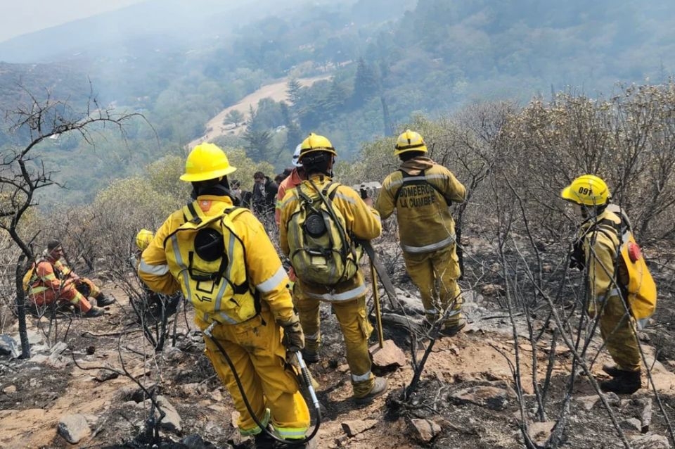 “Sigue activo el foco de la Quebrada de la Mermela. Más de 150 bomberos voluntarios trabajarán toda la noche en la zona, que es de una topografía de muy difícil acceso”, informa el último parte del Gobierno de la provincia.