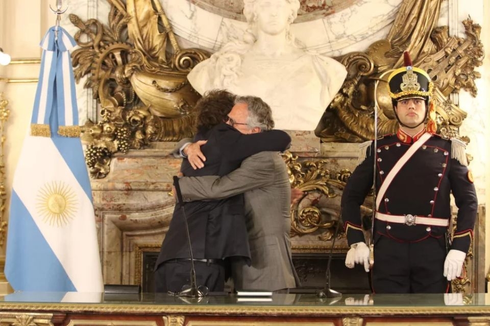 En segunda fila, visiblemente emocionado, el asesor presidencial, Santiago Caputo, aplaudía la modificación en el organigrama. Luego de que la locutora oficial diera por concluida la ceremonia formal, fue el primero en acercarse a Lugones, hombre de su extrema confianza, para saludarlo con un abrazo.