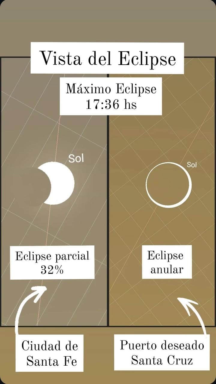 Desde nuestra ciudad se podrá ver un eclipse parcial desde las 16:23 (horario inicio) y el momento máximo se podrá vislumbrar desde las 17:36 cuando la luna cubrirá un 36% del disco solar. El fenómeno finalizará a las 18:40.
