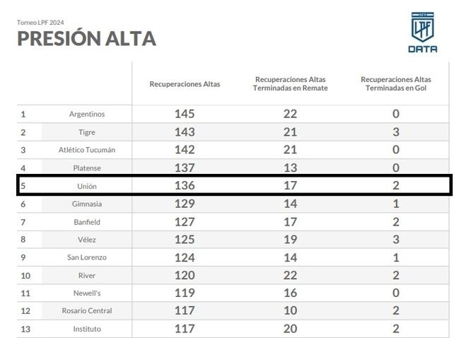 Eso sí, hay un factor que, pasadas 17 fechas, se mantiene inalterable: la presión alta. En la última actualización de la Liga Profesional, el Tate está quinto entre los más destacados en este rubro, con 136 recuperaciones: 17 terminaron en remates al arco y dos en goles.