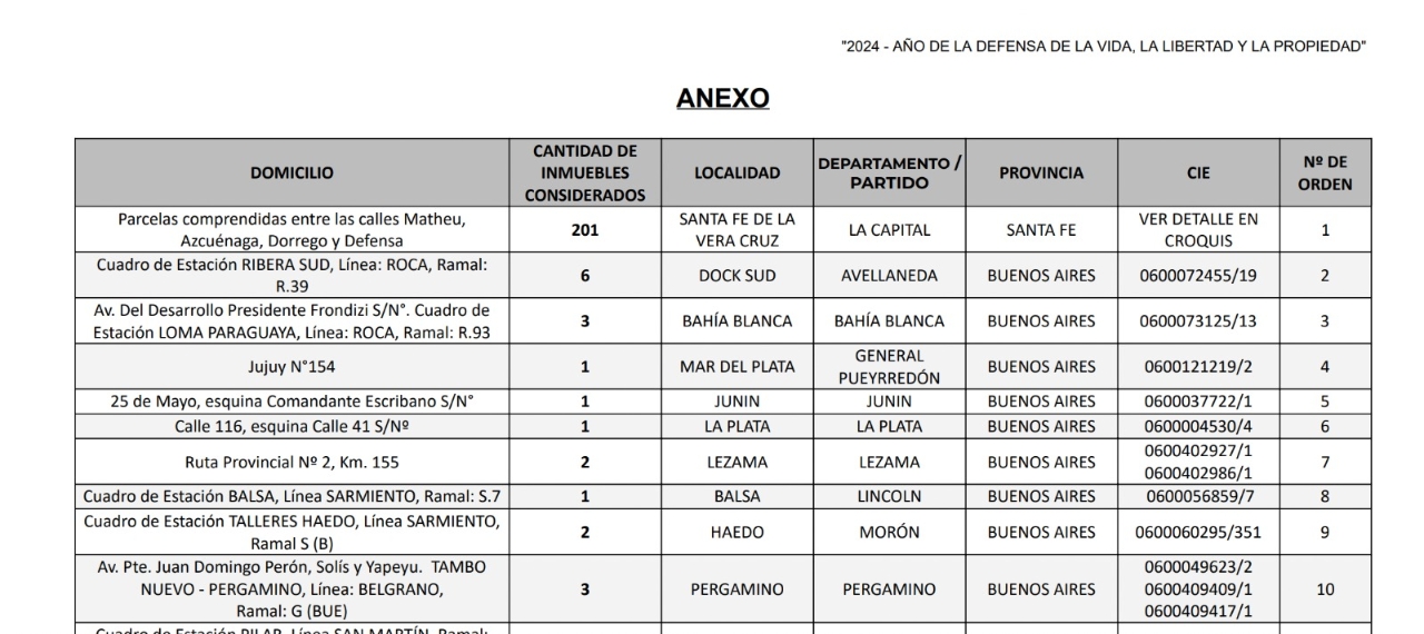 En el boletín oficial, el gobierno de Javier Milei publicó el decreto 950/2024, a través del cual autoriza la venta de terrenos nacionales en distintas ciudades del país. Dentro de esa lista, se incluyen 201 que pertenecen a Santa Fe.