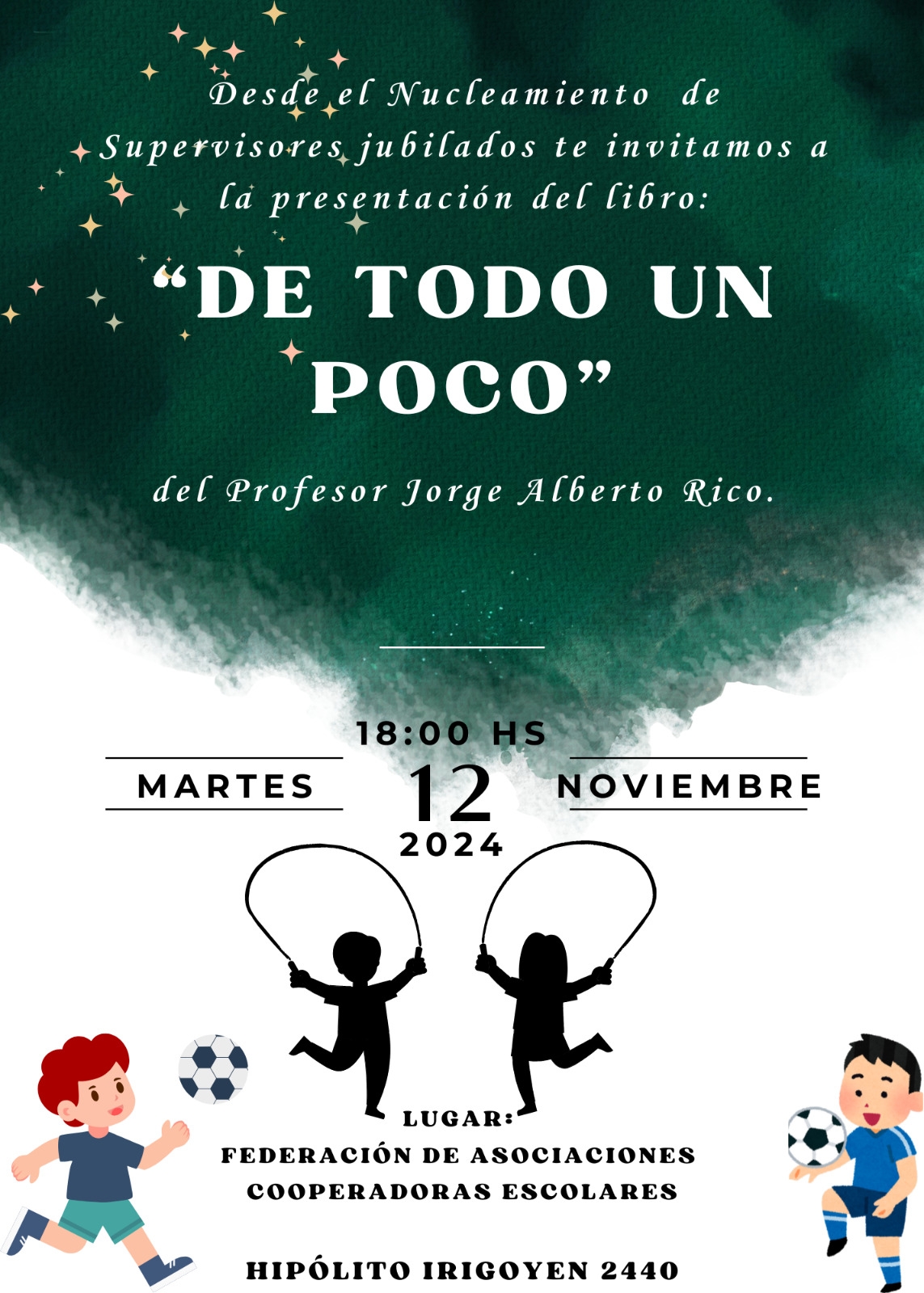 El Nucleamiento de Supervisores Jubilados – Zona Norte – de la provincia de Santa Fe comunican que el próximo martes 12 de noviembre se llevará a cabo la presentación del libro del Supervisor de Ed Física Jubilado Prof. Jorge Rico titulado “De todo un poco”.