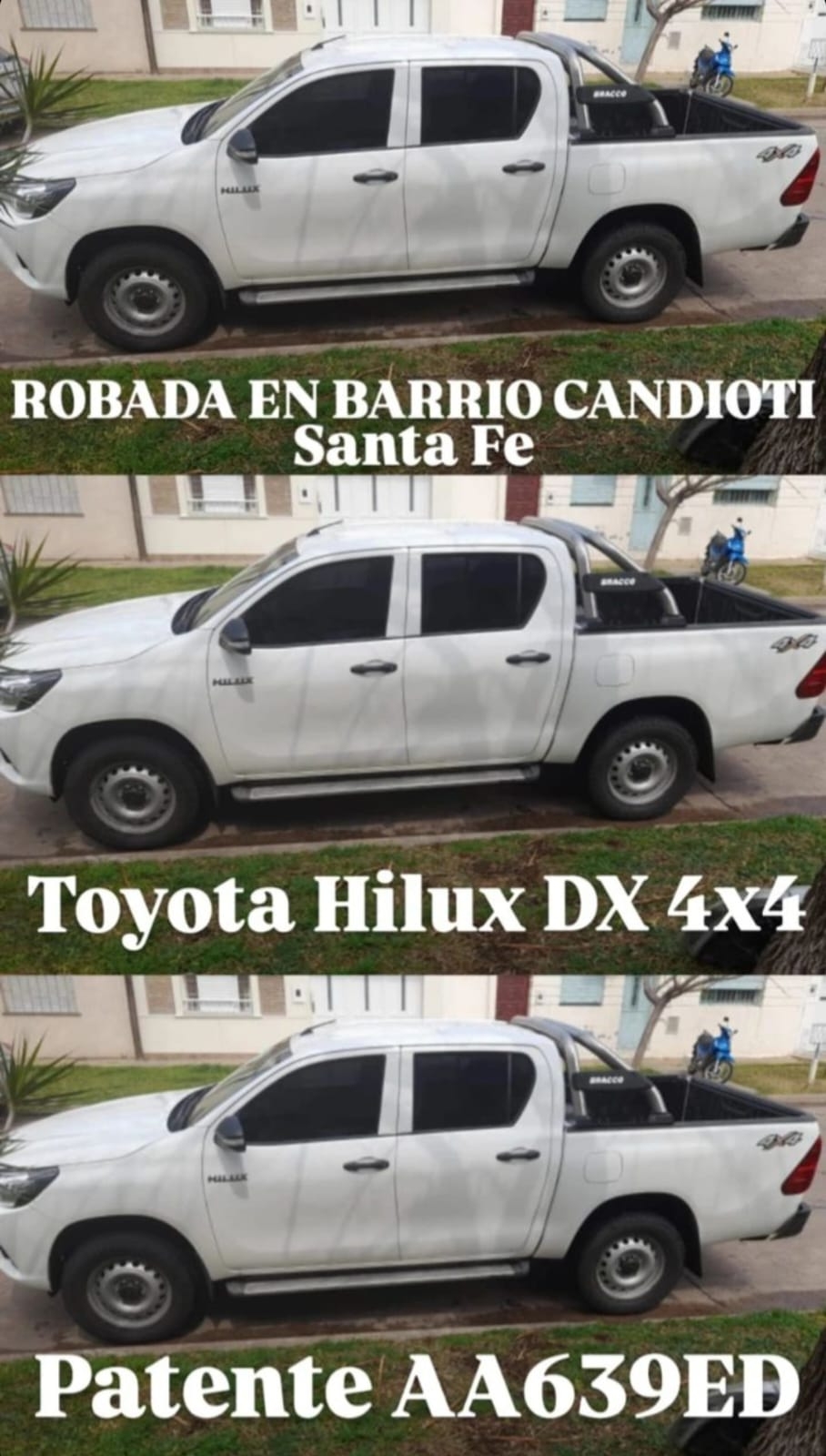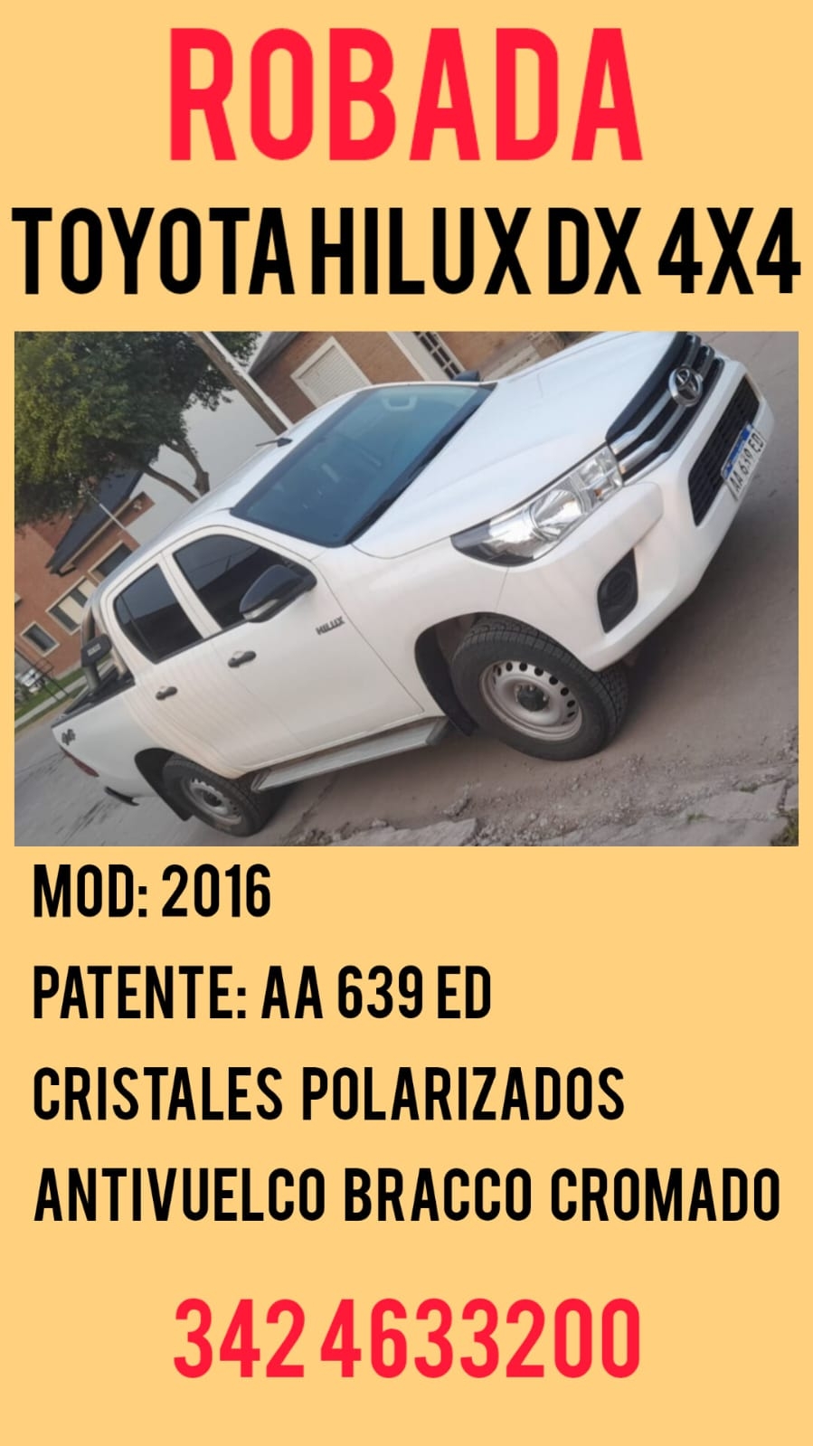 El vehículo robado es una camioneta Toyota Hilux DX 4x4 blanca, modelo 2016, patente AA639ED.