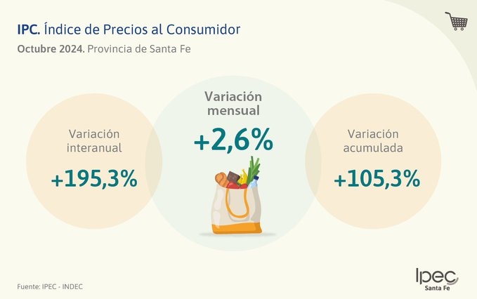 Según el último informe del Índice de Precios al Consumidor de Santa Fe, se registró en octubre de 2024 un aumento de 2,6% con relación al mes anterior.