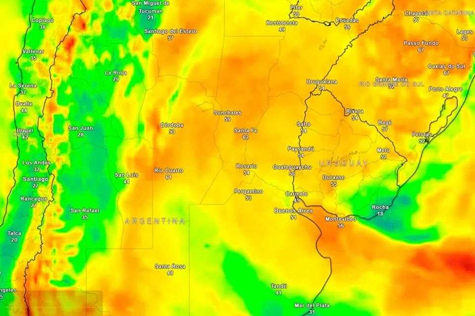 Precisaron que “el frente frío que comenzará a introducirse durante el fin de semana largo en el área central del país, provocará un abrupto cambio en la circulación de viento al sur y sudeste, impactando a la región de la costa atlántica al este de Buenos Aires y sur del Uruguay”.