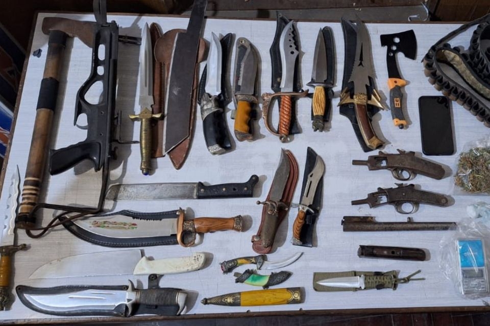 Tras el testimonio de la mujer, los agentes llevaron a cabo una inspección en la vivienda, donde encontraron una variedad de elementos vinculados a delitos graves. Entre los objetos secuestrados se encuentran: un pistolón desarmado (incluyendo dos mecanismos, un cañón y un agarre de madera), aproximadamente 20 armas blancas de distintos tipos y tamaños, un cartucho calibre 9 mm con punta teflonada, un cartucho calibre .22 mm, un contenedor plástico con perdigones para recarga, dos cananas sin cartuchería, una ballesta, una balanza de precisión digital, material vegetal presuntamente marihuana, un envoltorio con material blanco, aparentemente cocaína, un teléfono celular perteneciente al detenido.