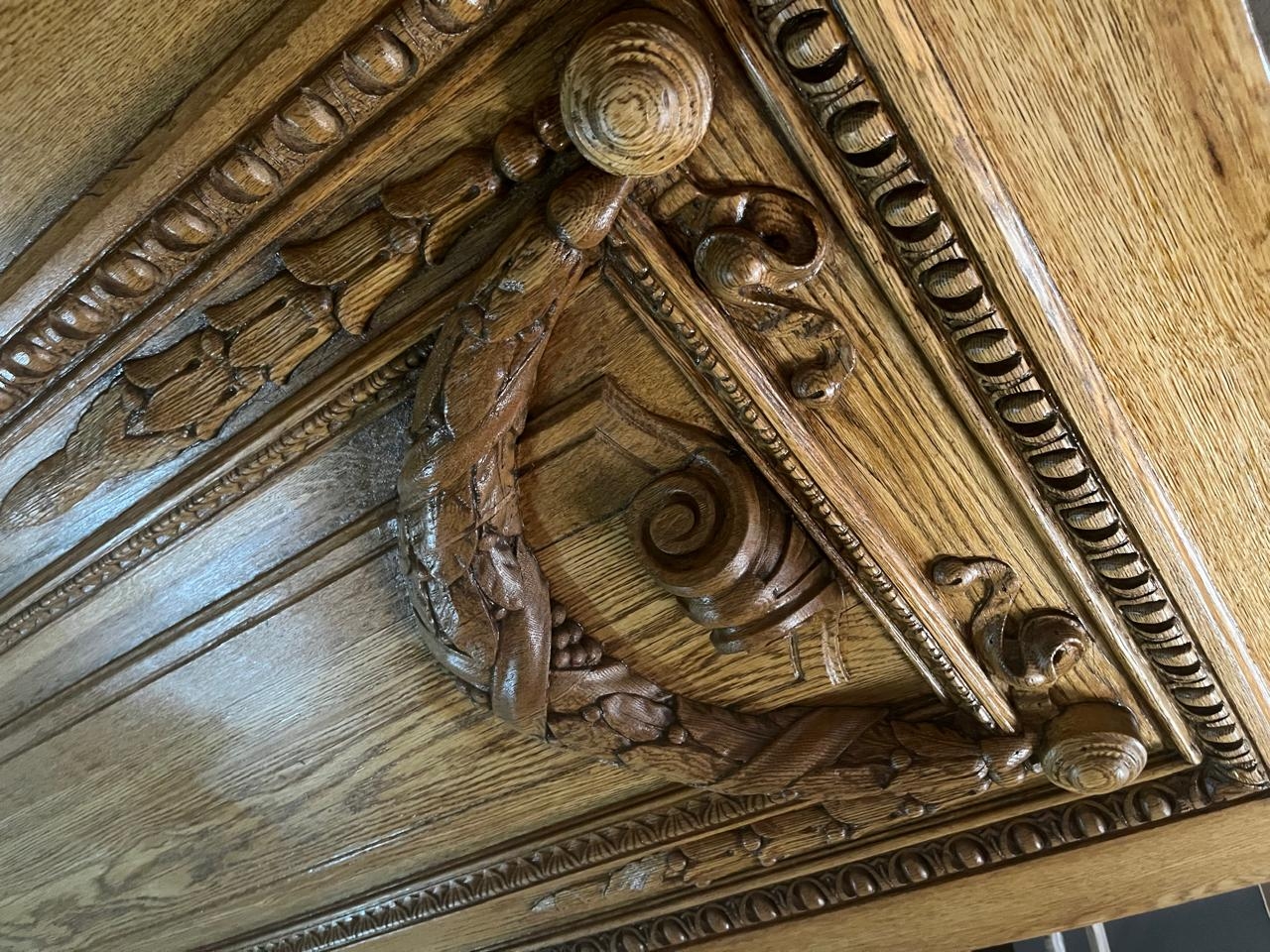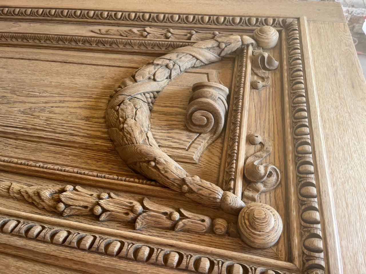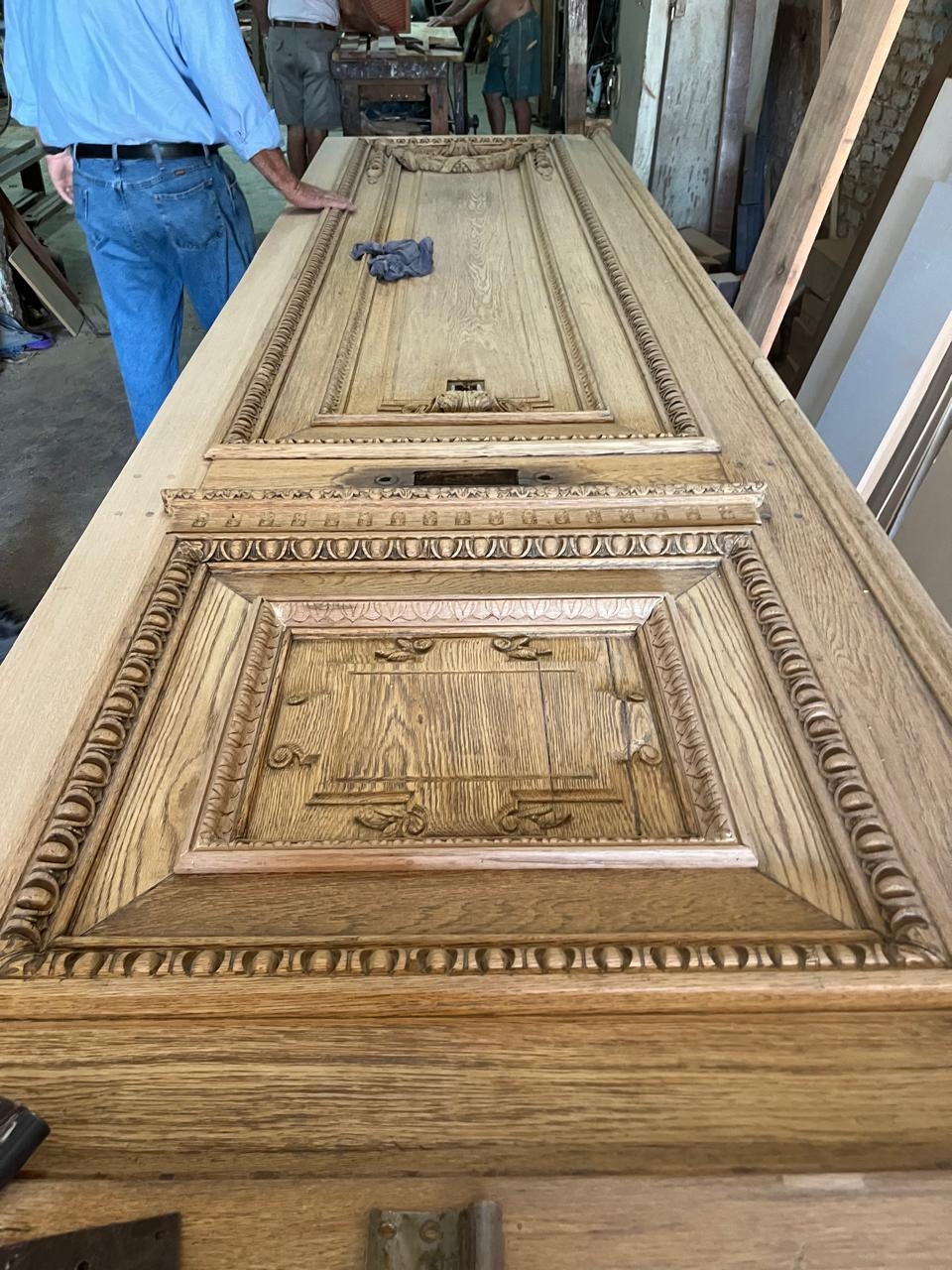 Primero se repararon los parantes rotos y los restos sirvieron para hacer las molduras y así utilizar la misma madera. Además, contó que al no conseguirse más el roble esloveno original, acudieron a otro que tiene la misma característica técnica y de resistencia, con al diferencia de que tiene una tonalidad más clara y hubo que teñirlo para que tenga un color parejo a la puerta.