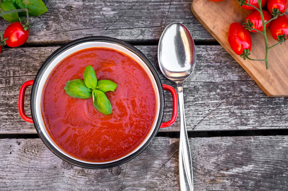 Preparación: Licuar los tomates, el pepino y el ajo. Sazonar con aceite de oliva, sal y pimienta. Servir bien fría y decorar con unas hojas de albahaca.