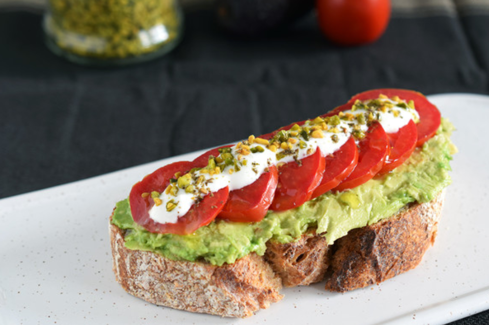 Preparación: Tostar las rebanadas de pan. Mientras tanto, machacar la palta con un tenedor y esparcirlo sobre las tostadas. Agregar rodajas de tomate, albahaca, un chorrito de aceite de oliva y sazonar con sal y pimienta.