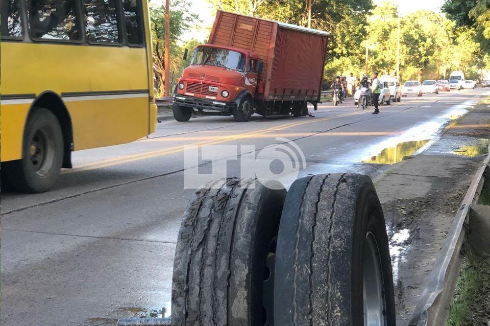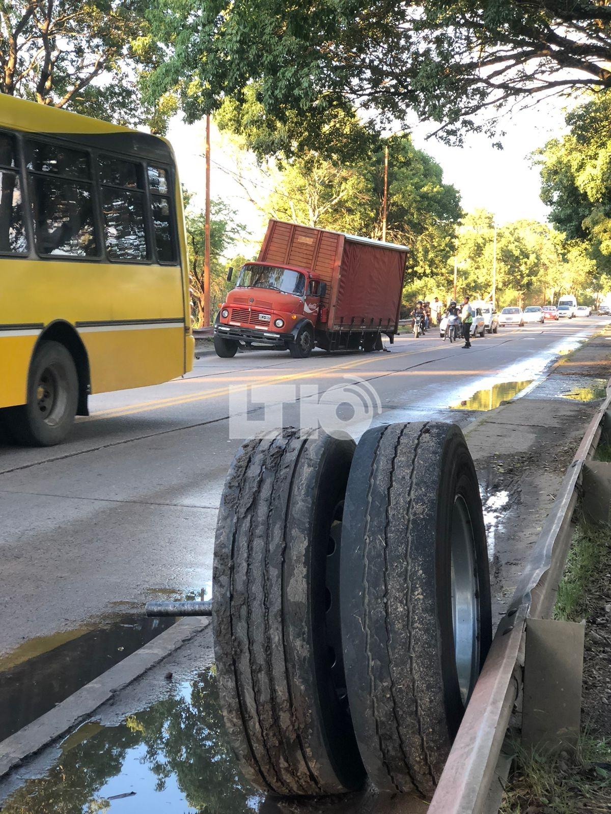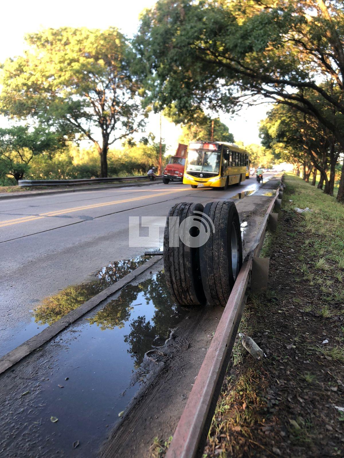 Un camión sufrió un desperfecto y quedó detenido en el acceso al Puente Carretero del lado del Santa Fe. El vehículo perdió una de sus ruedas duales que quedaron en el otro carril.