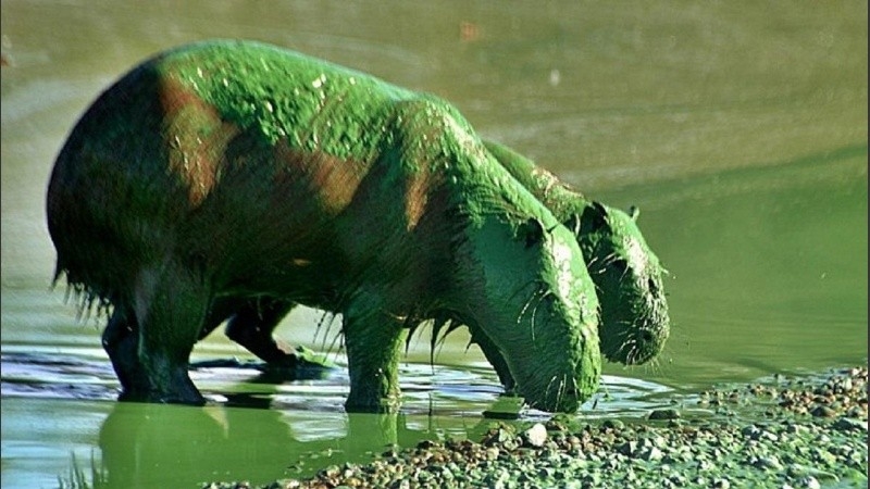Una de las postales más impactantes fue captada por el fotógrafo Juan Menoni, donde se ve a varios de los carpinchos –que viven en las inmediaciones de Puerto Luis– cubiertos por una capa de algas en todo su pelaje.