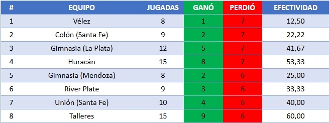 Justamente el Sabalero está entre los que más veces fueron despachados con definición desde los 12 pasos. Disputó nueve instancias, ganando dos y perdiendo siete. Solo está por detrás de Vélez, que tiene un encuentro menos, por lo que la efectividad es menor.