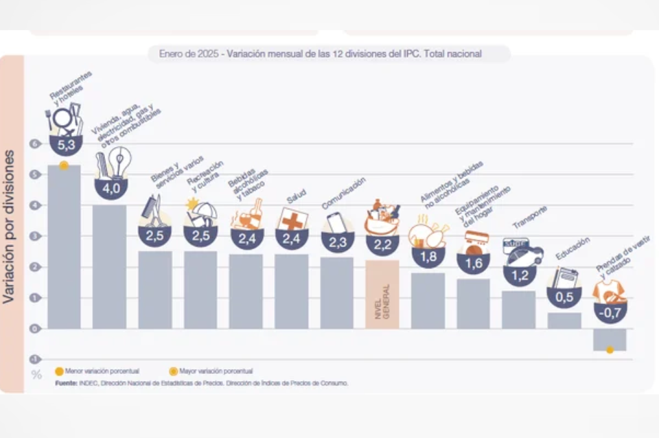 Las dos divisiones que registraron las menores variaciones en enero de 2025 fueron Educación (0,5%) y Prendas de vestir y calzado (-0,7%).