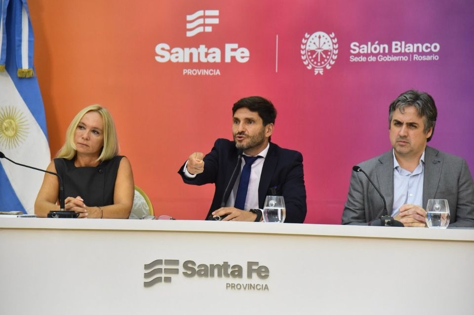 El gobernador Maximiliano Pullaro, acompañado por el ministro de Justicia y Seguridad de la Provincia, Pablo Cococcioni, y la fiscal General del Ministerio Público de la Acusación, María Cecilia Vranicich, presentan un programa de recompensas para todos los homicidios no esclarecidos desde el año 2018 hasta la fecha.