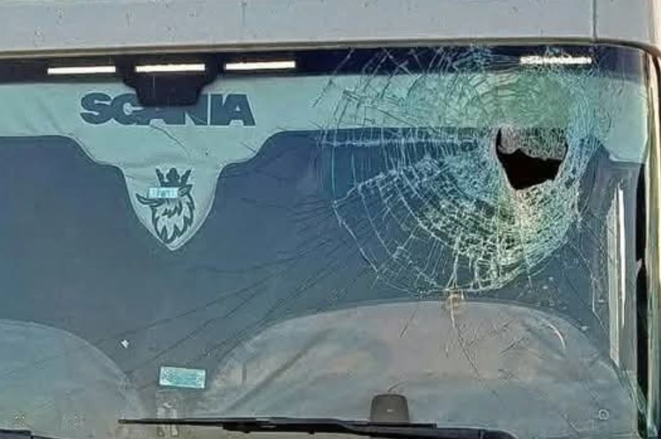 El conductor de un camión sufrió un impactante accidente cuando le arrojaron una piedra de importantes dimensiones mientras manejaba.