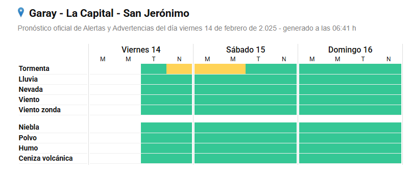 Según el informe, "el área será afectada por tormentas aisladas, algunas localmente fuertes. Las mismas estarán acompañadas por abundante caída de agua en cortos períodos, actividad eléctrica, ocasional caída de granizo y ráfagas que podrían estar entre 60 y 90 km/h".