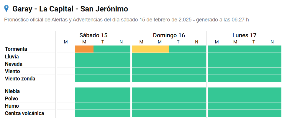 En tanto, para la madrugada y mañana del domingo, el alerta es amarillo, y establece que "el área será afectada por tormentas, algunas localmente fuertes. Las mismas estarán acompañadas por abundante caída de agua en cortos períodos, actividad eléctrica, ocasional caída de granizo y ráfagas que podrían estar entre los 60 y 80 km/h".