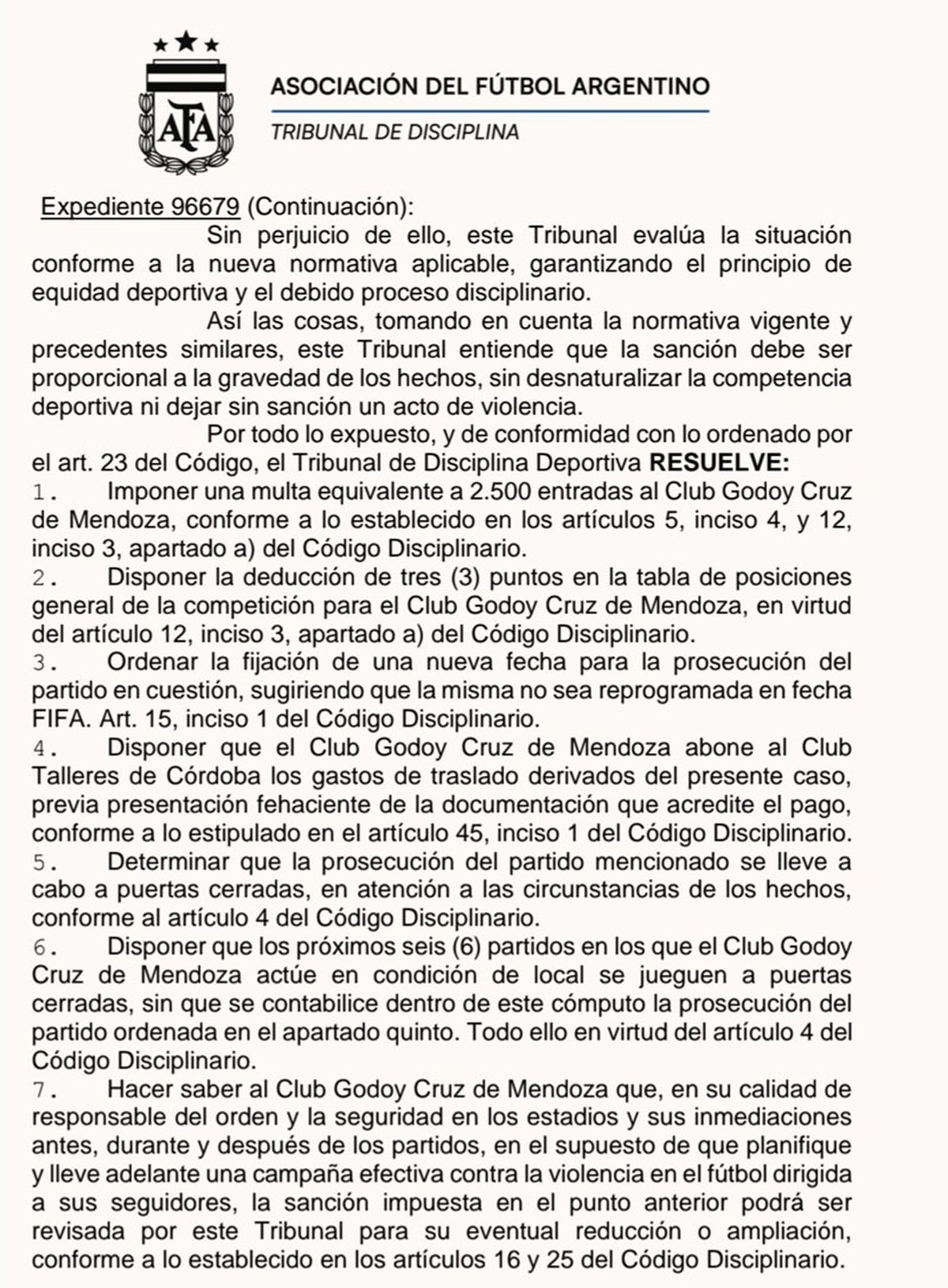 La sanción que el Tribunal de Disciplina de la Asociación del Fútbol al Tomba incluye el descuento de 3 puntosseis partidos a puertas cerradas y una multa de 2500 entradas. Además se completarán los 45 minutos restantes del cotejo con Talleres.