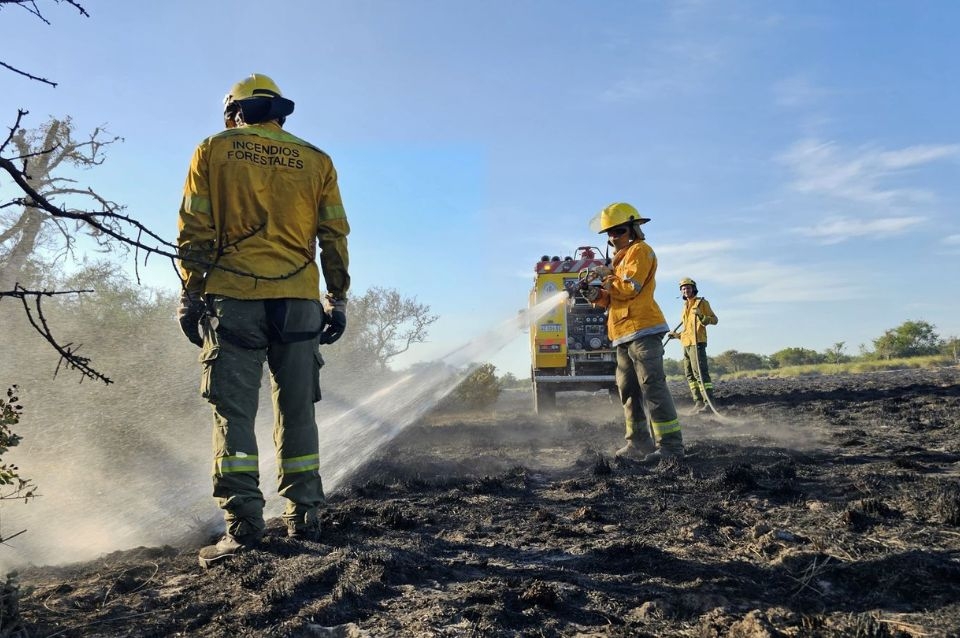 En el departamento San Javier, brigadistas santafesinos capacitados en incendios forestales trabajan para controlar el incendio que se originó días atrás.