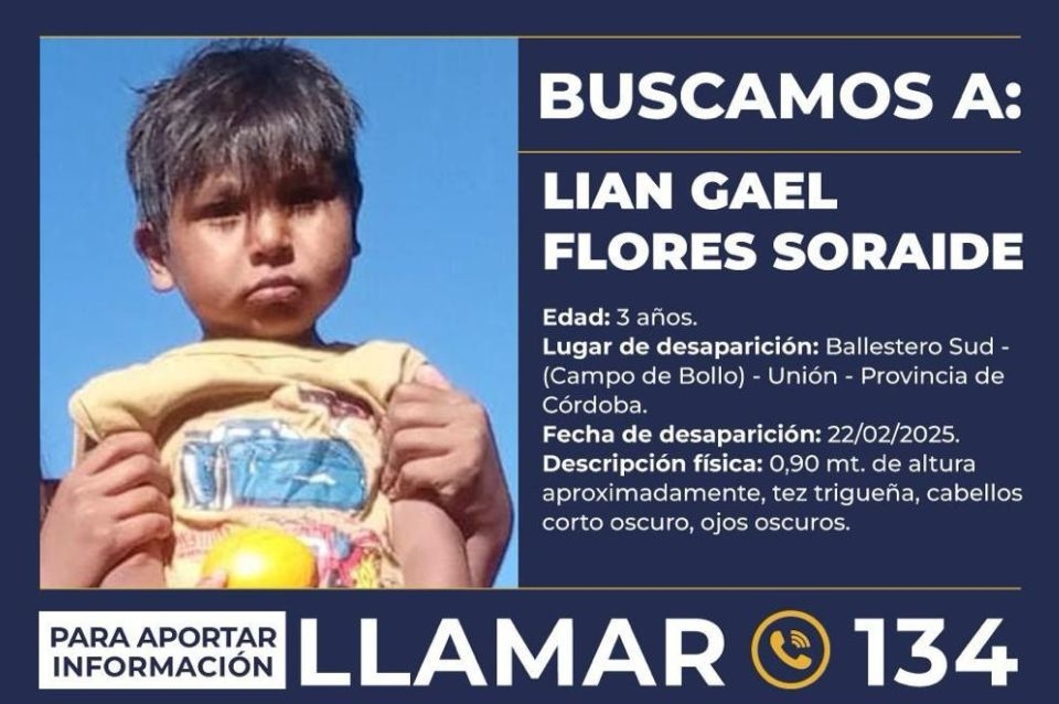Lian fue visto por última vez en la tarde del sábado en la localidad cordobesa de Ballesteros Sud cuando, según declaró su padre, todos se fueron a dormir y la siesta y al despertar no lo vieron más.