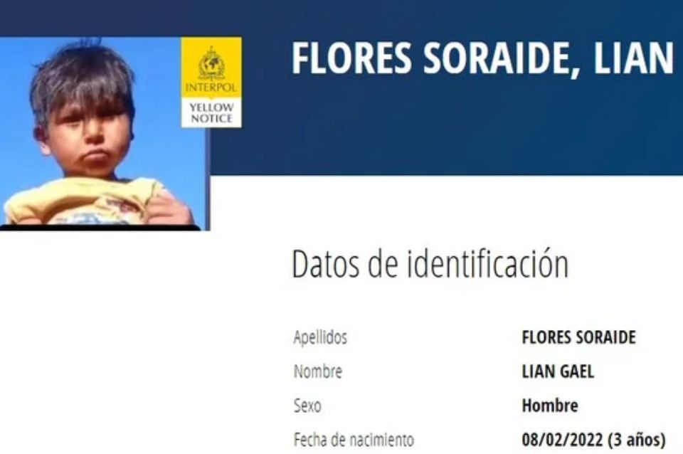 La organización Interpol difundió este martes en su página oficial una foto con el rostro de Lian Gael Flores, el niño cordobés desaparecido el sábado pasado.