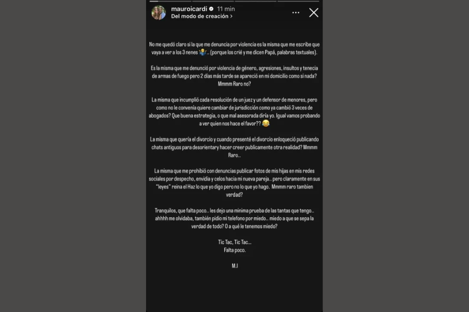 “No me quedó claro si la que me denuncia por violencia es la misma que me escribe que vaya a ver a los tres nenes. Porque los crie y me dicen papá, palabras textuales”, remarcó Icardi en sus historias de Instagram, que horas más tarde eliminó.