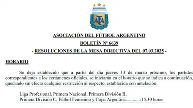 Allí el ente rector de nuestro fútbol expresó que: "Se deja establecido que a partir del día jueves 13 de marzo próximo, los partidos correspondientes a los certámenes oficiales, se iniciarán en el horario que se indica a continuación, quedando sin efecto cualquier restricción al respecto, establecida con antelación: Liga Profesional, Primera Nacional, Primera División B, Primera División C, Fútbol Femenino y Copa Argentina……..: 15.30 horas".