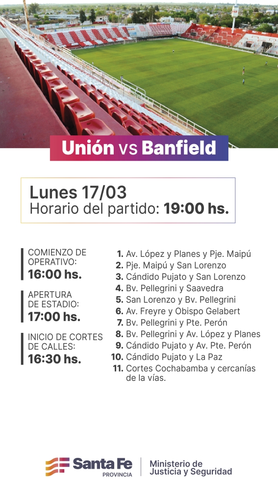 Además, se dispuso de once cortes de calle, a partir de las 16.30hs, en las inmediaciones del Estadio 15 de Abril.
