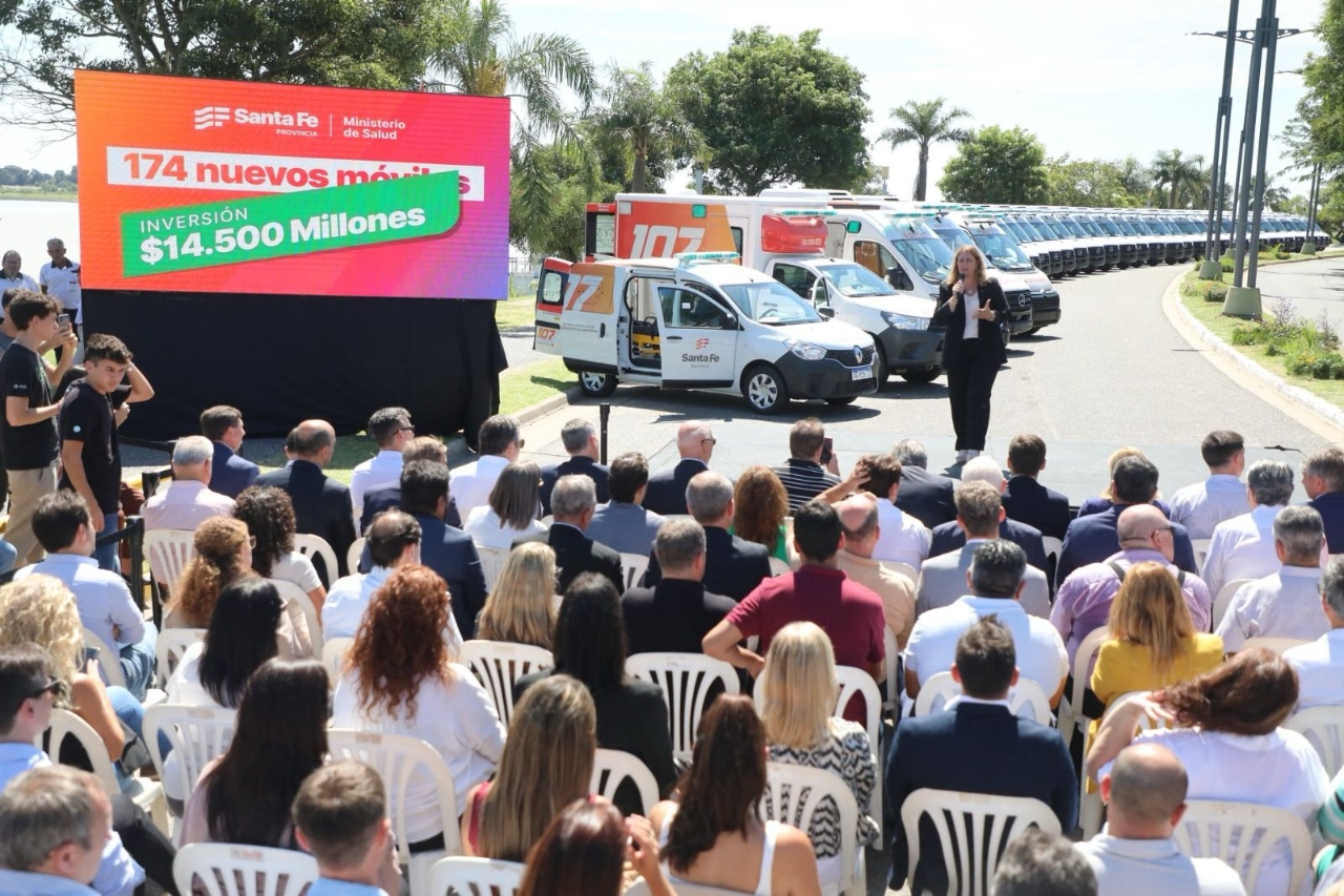 El gobernador Maximiliano Pullaro, junto a la vicegobernadora Gisela Scaglia, presentaron este lunes la nueva flota de 174 ambulancias 0 Km, que serán distribuidas de acuerdo con criterios sanitarios para reforzar la atención en todo el territorio santafesino.