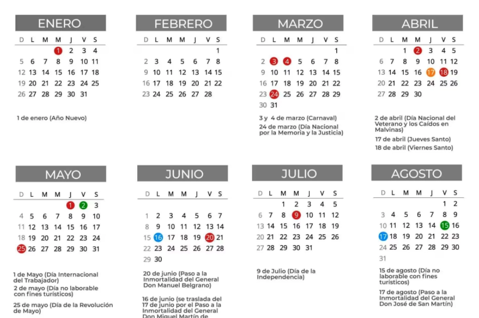 - Abril: 2 de abril (Día del Veterano y de los Caídos en la Guerra de Malvinas), 18 de abril (Viernes Santo).