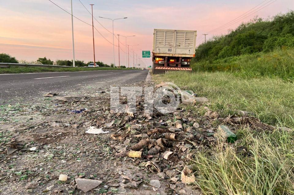 Según contó el conductor, mordió un importante pozo que hay en la calzada, lo que provocó que se abriera la puerta del chasis y perdiera parte de su carga de vidrio que quedó esparcida.