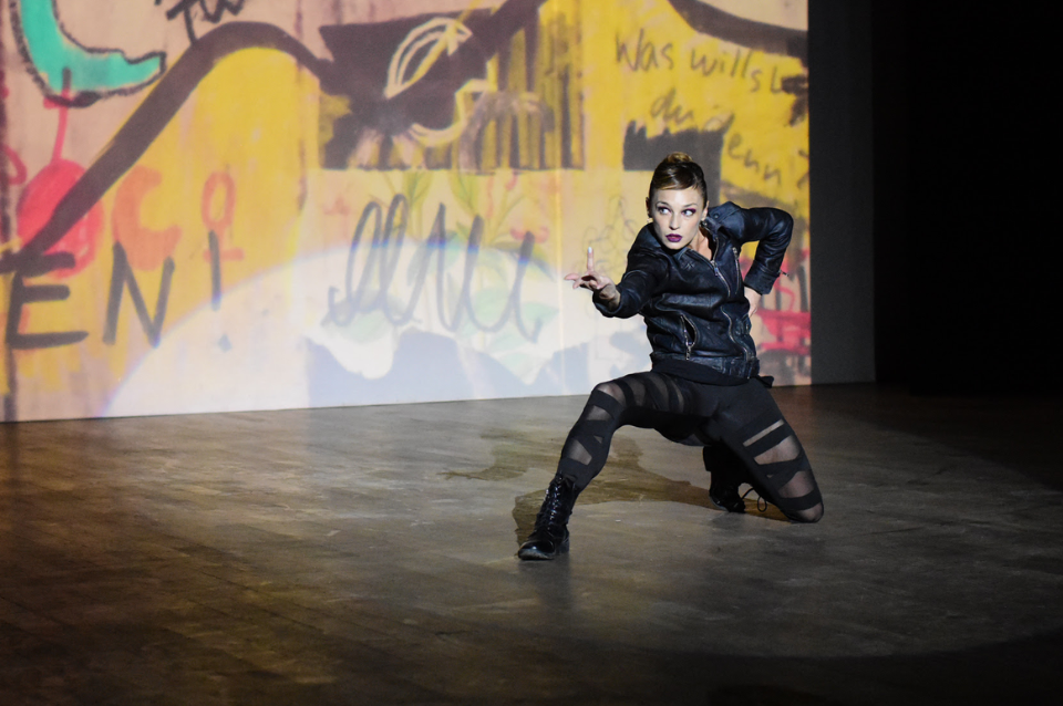 “La mujer también en casa” es una pieza en clave feminista que usa un estilo de danza expresionista idiosincrásica y está estéticamente inspirada en el universo punk y la cultura visual berlinesa. La pieza se creó como una respuesta coreográfica-teatral al contenido de una multitud de frases con gran carga sexista que el coreógrafo escocés debía aprender mientras estudiaba una audioguía Alemán-Inglés.