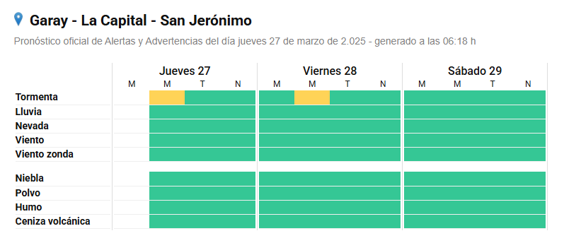 El Servicio Meteorológico Nacional emitió un alerta amarillo por tormentas que abarca a toda la provincia de Santa Fe tanto para la mañana de este jueves como para la mañana del viernes. El mismo establece que "el área será afectada por lluvias y tormentas, algunas fuertes. Las mismas podrán estar acompañadas por intensa actividad eléctrica, abundante caída de agua en cortos períodos, ráfagas fuertes y ocasional caída de granizo granizo".