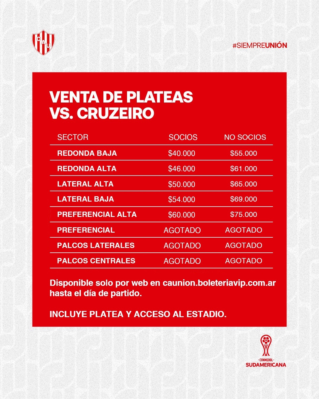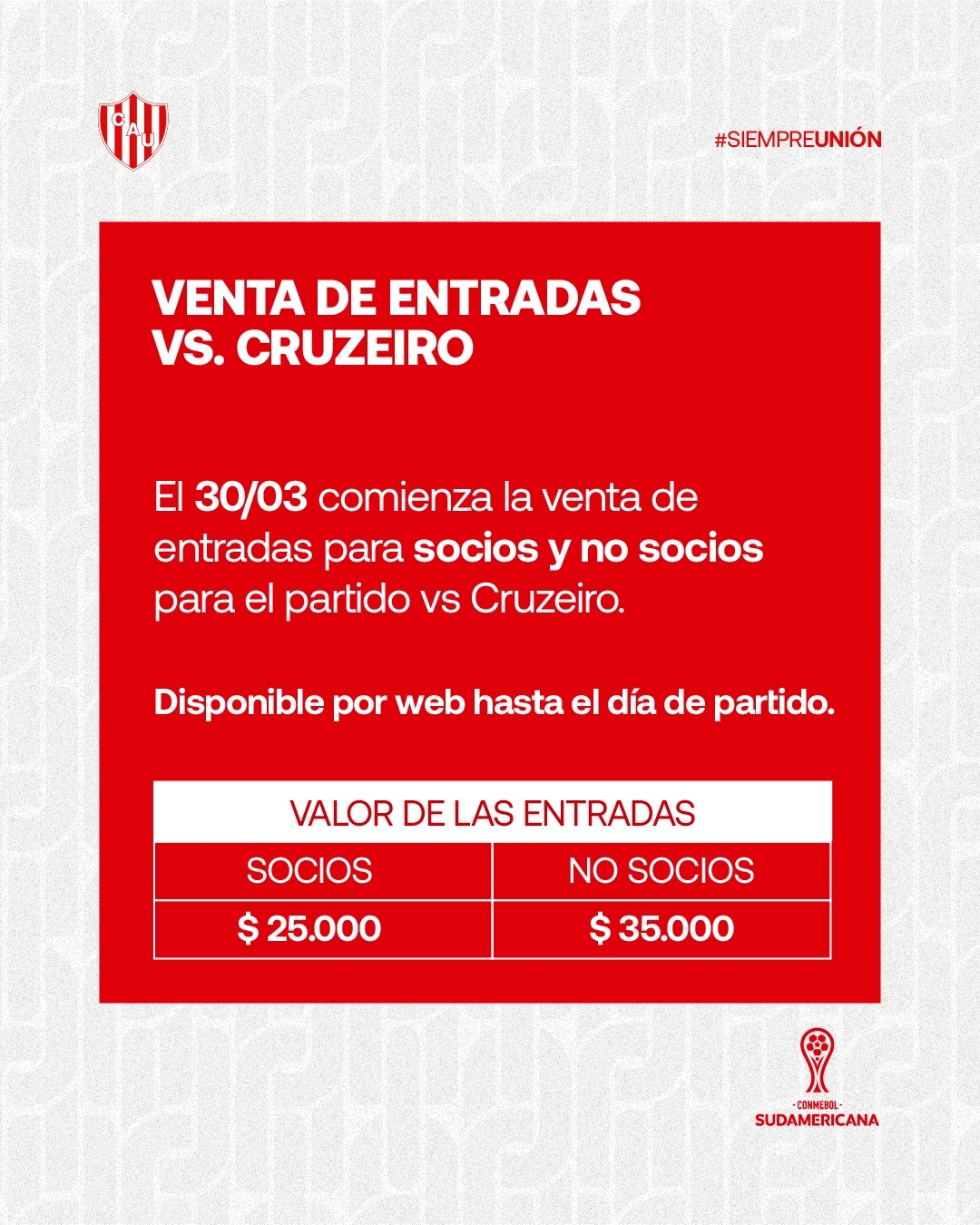 Unión anunció oficialmente la venta de entradas para el duelo ante Cruzeiro, correspondiente a la primera fecha del Grupo E de la Copa Sudamericana. El encuentro se disputará este martes a las 19 en el estadio 15 de Abril.